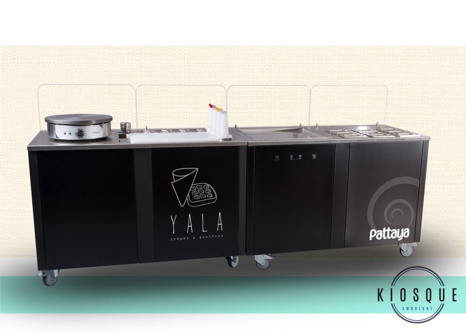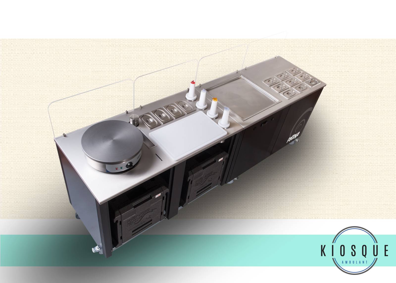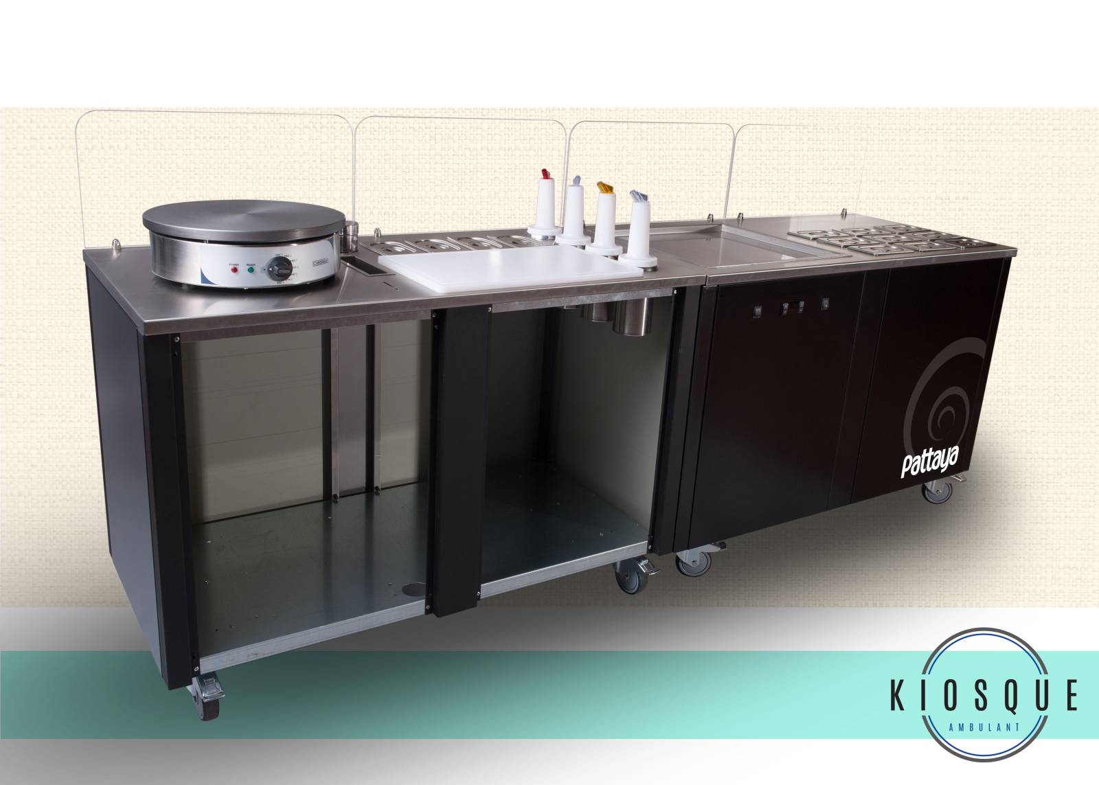 Ce chariot ambulant crêpes et glace démontable bénéficie d'un double espace sec sous le plan de travail afin de pouvoir entreposer des équipements comme par exemple: glacières eutectiques, réfrigérateur, congélateur Top... Chaque chariot ambulant crêpes et glaces bénéficie d’une finition en acier inoxydable noir pour. Aménager son atelier crêpes et glace dans de bonnes conditions n'est pas toujours évident. Il faut du matériel qui se déplace facilement, des équipements robustes et peu encombrant. KIOSQUE AMBULANT vous propose les meilleures solutions commerciales, designs, techniques et logistiques. Pour une installation facile du matériel CHR et pour la mise en place des prestations de type crêpes, gaufres et glaces, le chariot ambulant crêpes et glace représente la solution idéale.