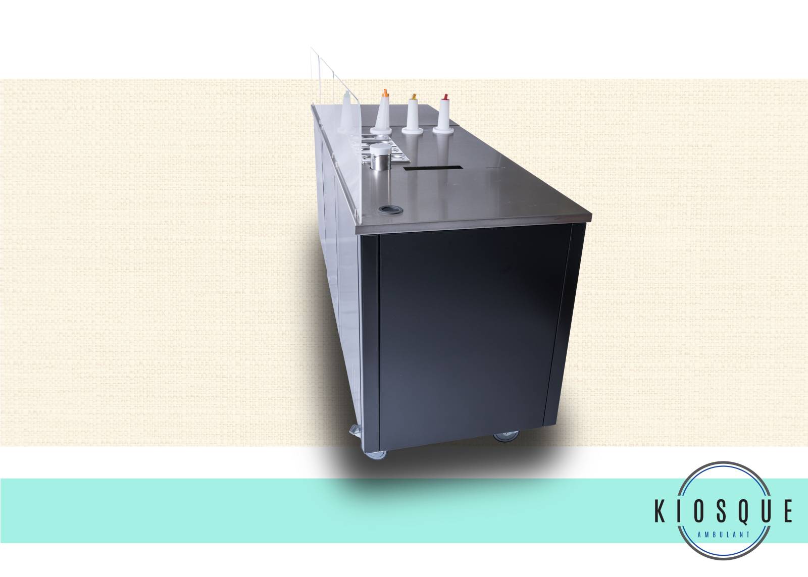 Vous pouvez installer des compartiments froids sous le plan de travail inox (glacières eutectiques, réfrigérateur, congélateur Top...). Chaque chariot ambulant dispose d'une finition en acier inoxydable. Nous proposons également une personnalisation complète de votre stand aux couleurs de votre marque.