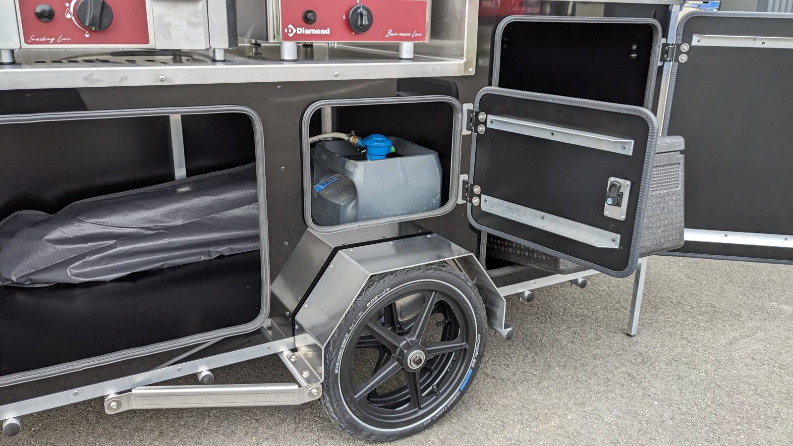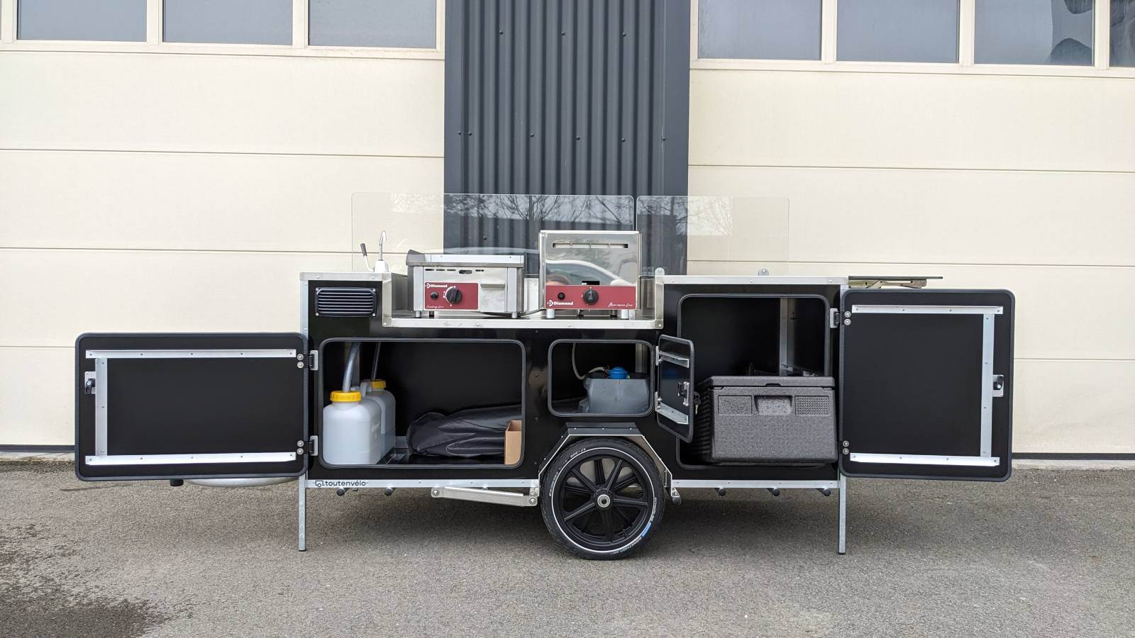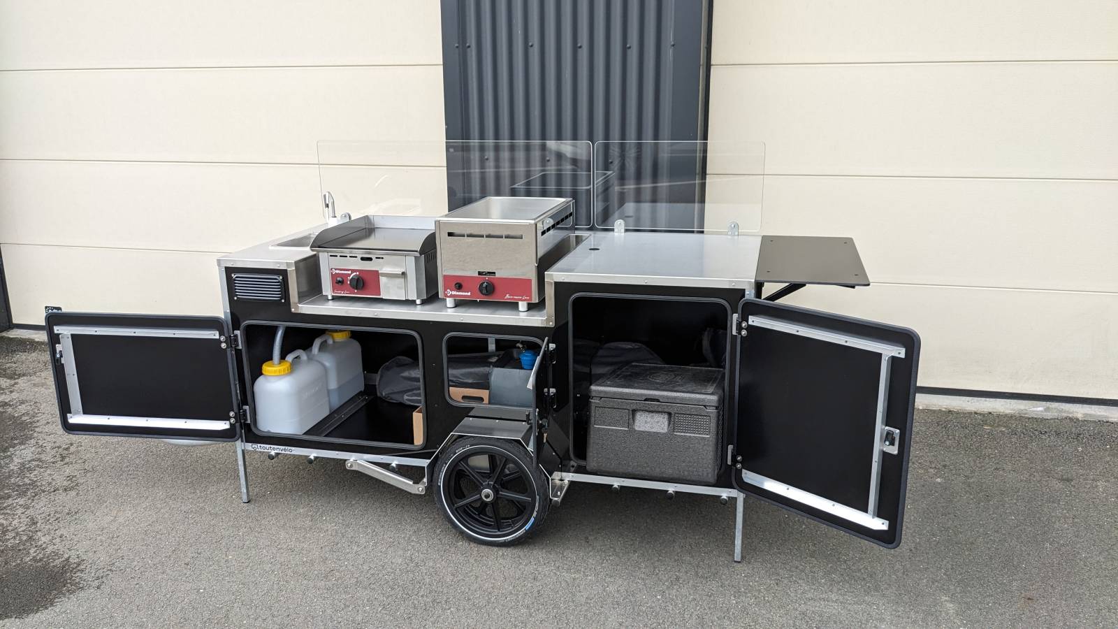 La remorque est la solution idéale pour développer la vente ambulante en dehors de votre restaurant, ou tout simplement pour commencer votre activité dans le secteur de la street food. Elle vous offre la flexibilité d'exercer votre activité dans les zones les plus animés, les plus attractives, lors d'un évènement... Conçu pour supporter jusqu'à 300kg de charge utile, cette remorque peut être entièrement équipée en matériel CHR (planche à snacker, bain marie, gaufrier, crêpière...) selon vos besoins et vos envies. Sa structure en Dibond nous permet de personnalisée entièrement votre remorque food aux couleurs de votre entreprise. Vous avez ensuite la possibilité de la déplacer grâce à un vélo ou une voiture.